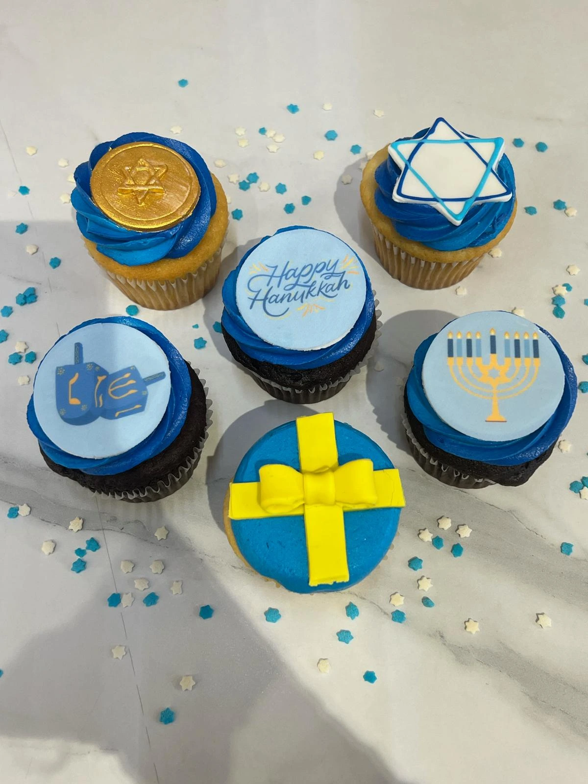 3 vanilla + 3 chocolate cupcakes, topped with blue icing and custom Hanukkah toppers.